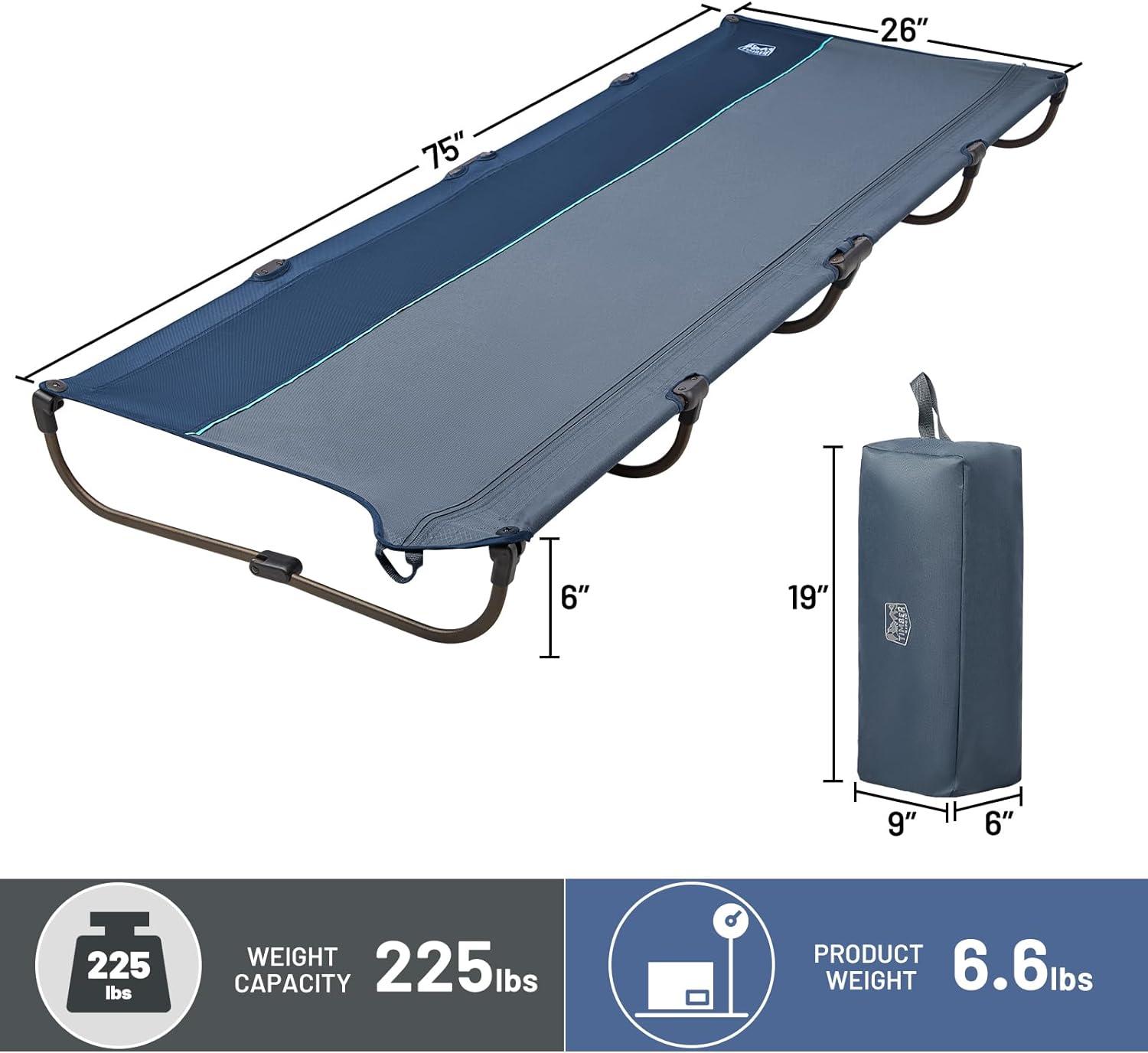 LIGHTWEIGHT & HEAVY DUTY: This folding cot is made with 20mm*10mm aluminum pipes, only weights 6.6lbs. U-shape sturdy structure to distribute the weight well and prevents poking through the tent floor, supports up to 225lbs. (The maximum weight of our cot is 225 pounds, so sorry that some products TAG marked wrong)