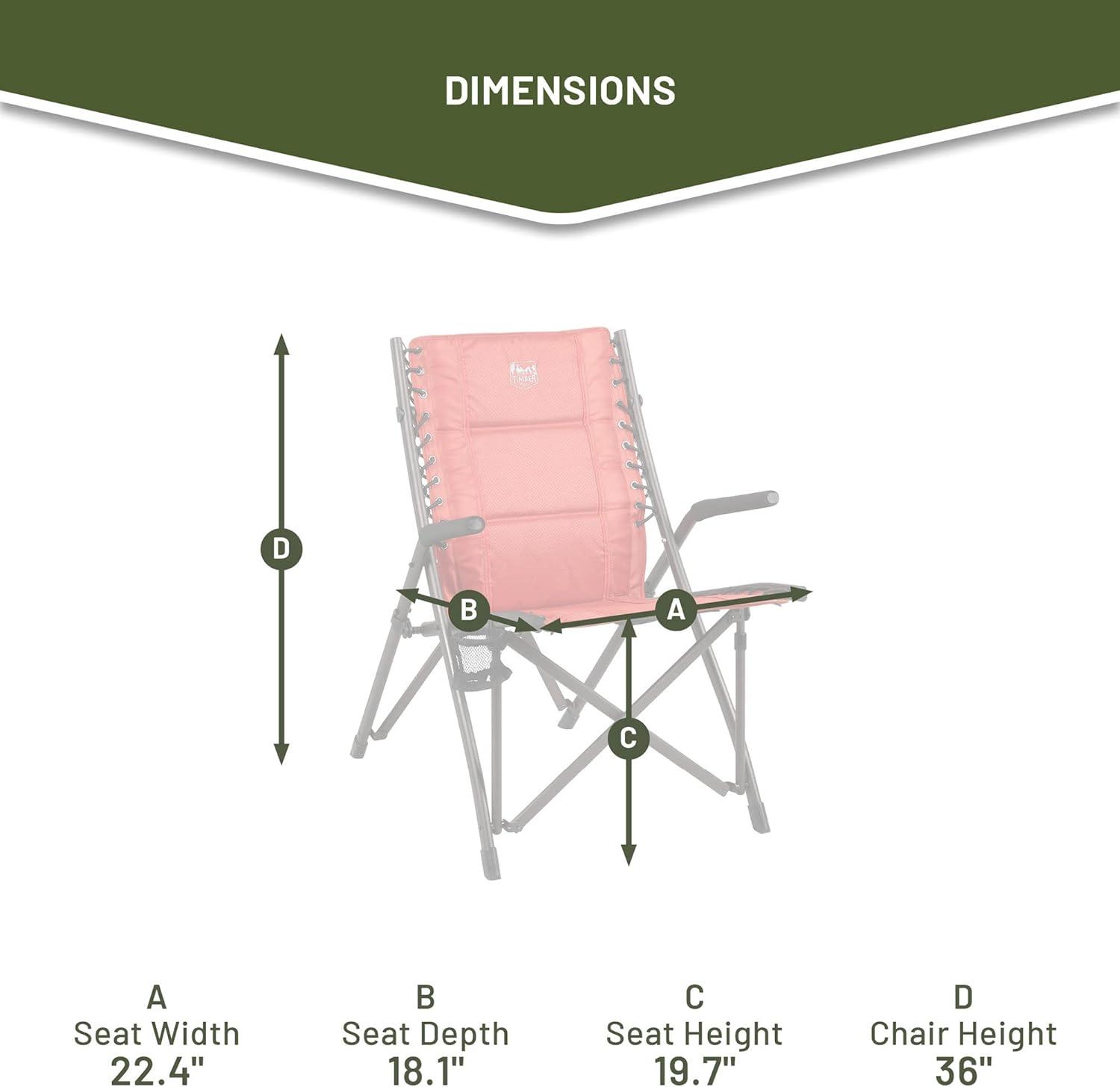 Get comfy anywhere at any time, whether you're in the woods or in your backyard, with the Timber Ridge Fraser Deluxe Folding Outdoor Bungee Chair. The sturdy powder-coated steel frame and 600D polyester fabric provide stability and can support up to 300 lbs. The bungee-cord suspension system is designed to provide maximum relaxation, while the back is slightly tilted for a comfortable resting angle. The smooth foam padded seat and back offer added comfort, and the integrated drink holder keeps a beverage within reach for your convenience. The bungee chair's effortless folding mechanism guarantees easy storage, while the carry bag with strap included guarantees easy transport. Measuring 22.44″ x 36.2″ x 18.11″, the folding chair is perfect for the lawn, camping, sporting events, and other outdoor activities.