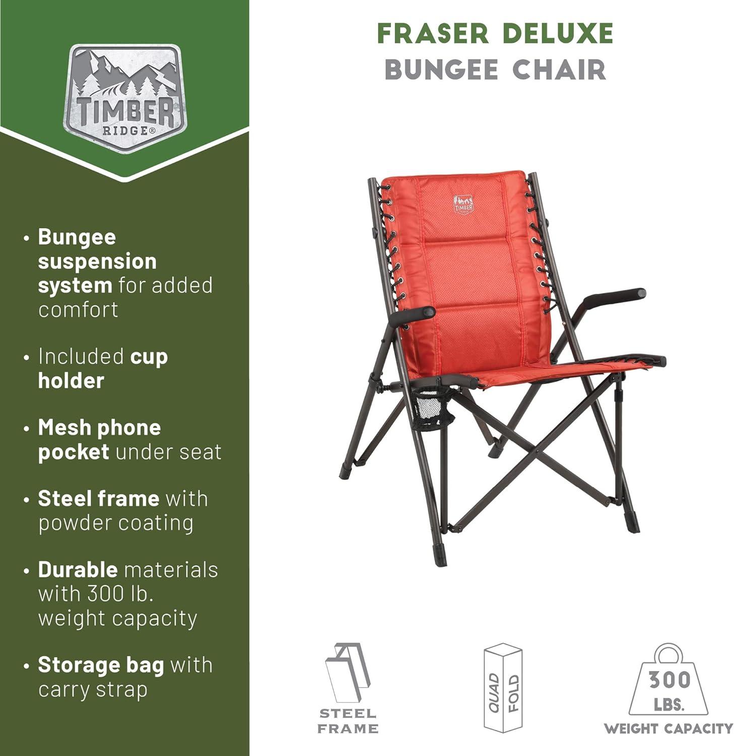 OUTDOOR BUNGEE CHAIR: This TIMBER RIDGE camping chair with padded seat, hard armrests, cup holder and carry bag is the ideal lounge chair for camping, patio or sideline sports. It supports 300 lbs