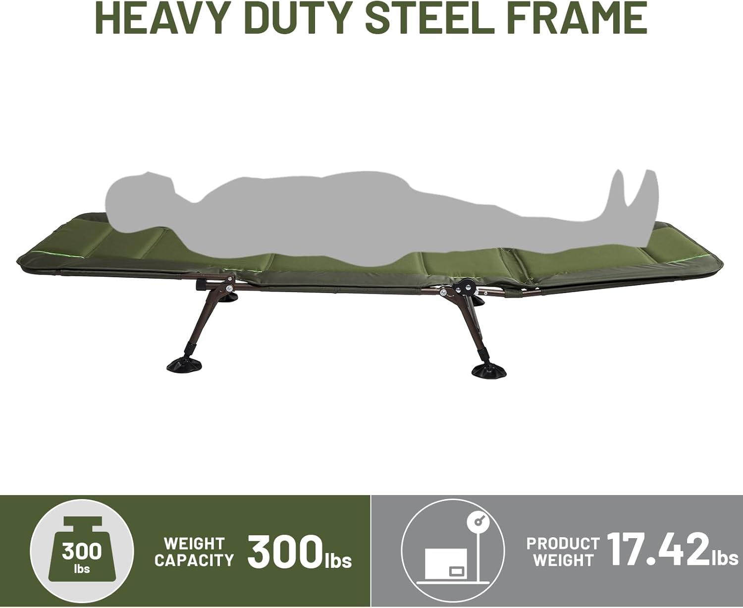 HEAVY DUTY & STABL: The camping cots for adults provide utmost stability with 6 powerful support feet and flexible grip to accommodate uneven ground, this folding bed is built to withstand heavy use and has a weight capacity of 600lbs