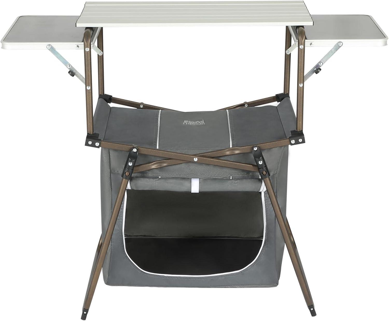 This camp table is easy to clean, built to last, and provides ample storage with the under-table storage pantry. It measures 26.6″ x 3.7″ x 23.2″ when folded up for portability, and 42″ x 13.6″ x 33.5″ when fully assembled.